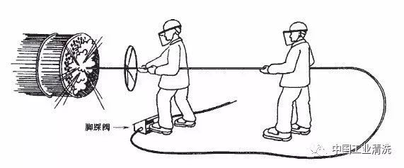 作业时,喷头应在设备升压前就进入被清洗容器中,以免射流伤及操作者;反之,喷头从容器中取出前,没备必须卸压。