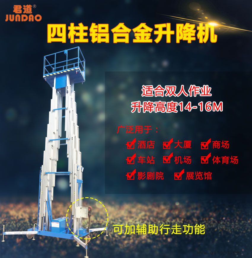 性能特点:双人四柱式工作铝合金升降机,工作高度可达17.7米,配有地面、平台两套操作按钮及围栏自动升降系统,方便使用操作,电动液压升降,升降柱采用双链条式高强度铝合金型材,安全可靠升降平稳,无噪音液压单元经久耐用,设备移动方便灵活。