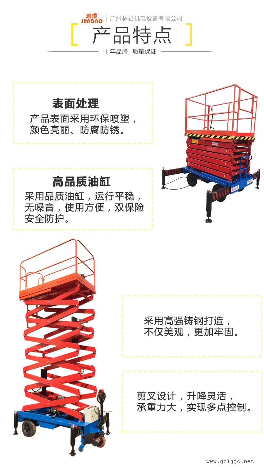 该产品与其他高空作业平台相比其zui大的特点就是可以控制让其自动行走,而普通的升降平台则无法实现此功能,必须借助人工牵引或是机械牵引来实现行走,有时在从事户外作业的时候也会面临不方便接电源的窘境,大大降低了高空作业的工作效率。而该产品无需外接电源,无线手柄控制行走,速度可调试,移动灵活、操作简单方便。只需一人便可完成前进、后退、转向、升降等动作,省工、省力。它使高空作业效率更高,安全更有保障,是现在较理想的高空作业设备。