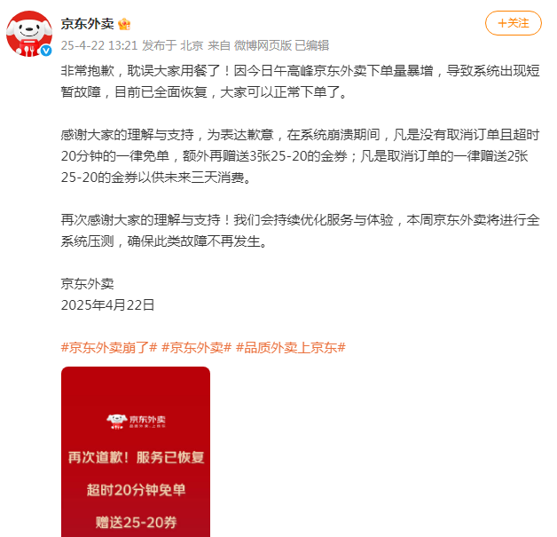 京东外卖近期还遭遇了一次系统挑战,但迅速采取措施恢复了服务。4 月 22 日中午,由于用户下单量急剧增加,系统出现了短暂的故障。京东外卖团队迅速行动,在短时间内全面修复了系统,确保了用户可以再次正常下单。为了弥补给用户带来的不便,京东外卖发表声明,表示将对所有超时 20 分钟以上的外卖订单进行免单处理,并额外发放一张价值 10 元的无门槛优惠券至其下单账户。