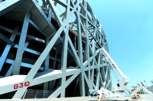 昨日,工作人员利用“蜘蛛车”清理北京“鸟巢”外围钢结构。当日,从意大利引进的一台高空清洗机械“蜘蛛车”开始对“鸟巢”外围钢结构进行清洗作业测试。该车酷似蜘蛛,价值400万,可自行“行走”,高度zui大可达48米。新华社发