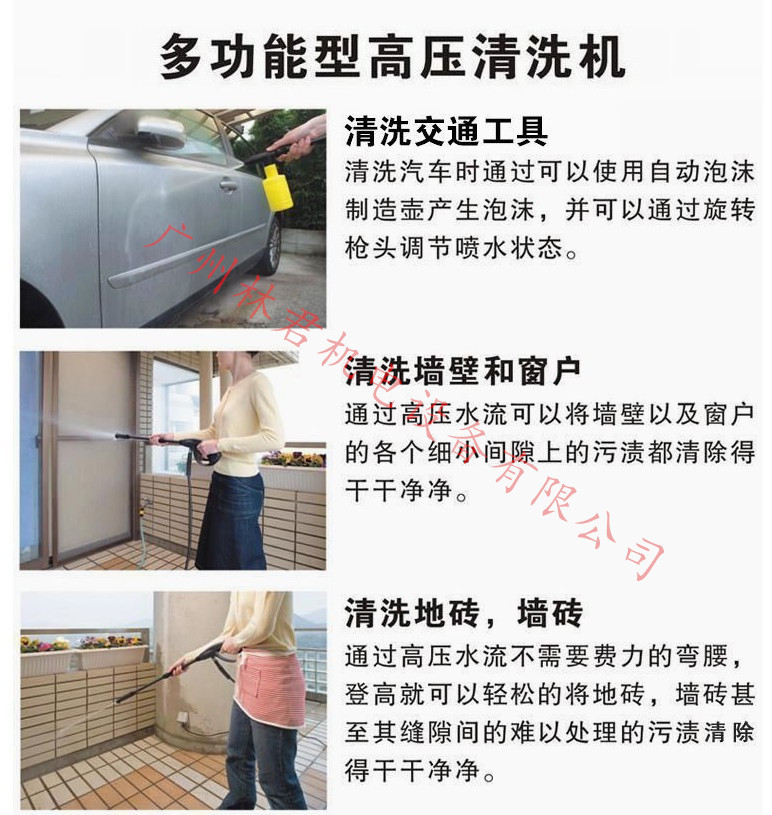 小型商用高压清洗机/小型冷水高压清洗机,小型高压清洗机可以无级调节压力以适应不同清洁任务,在使用清洁液喷嘴时可以自吸和喷洒清洁液,商业级斜盘泵配置铜泵头和机油视窗,漏电保护插头会在机器漏电时切断电源以防电击,机架配置橡胶后轮, 便于移动,适用于汽车、餐馆、养殖业、保洁行业的日常清洁。全国销售.