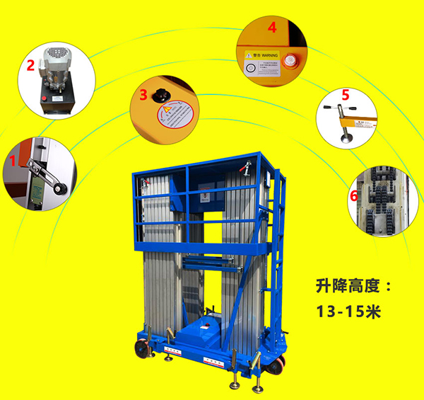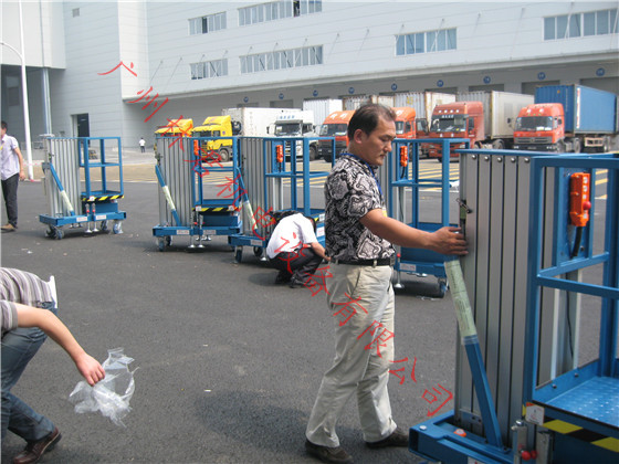 (2)双立柱铝合金升降机:全新设计的新一代产品,整体采用高强度铝型材精制而成由于型材强度高,使升降台的偏转与摆动极小。采用双桅柱式结构,载重量大,平台面积大,稳定性极好,运转灵活,推行方便。 多柱式