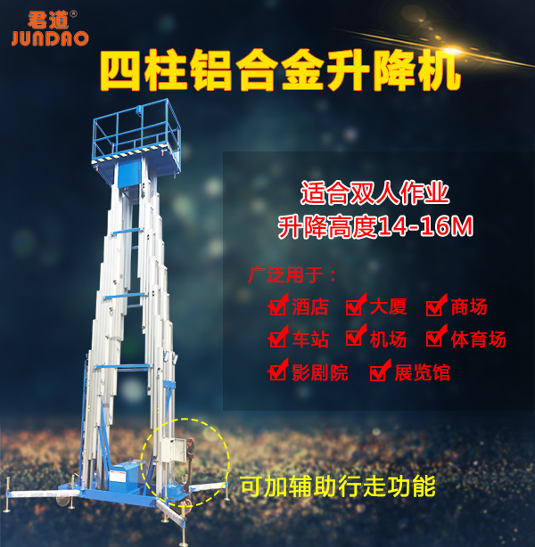 (4)四立柱铝合金升降机:整体采用高强度铝型材精制而成由于型材强度高,采用四桅柱式结构,稳定性极好,运转灵活,载重量大,平台面积大,推行方便。它轻盈的外观,能在极小的空间内发挥zui高的举升能力。使升降台的偏转与摆动极小。该升降机广泛用于厂房、宾馆、大厦、商场、车站、机场、体育场等。可用作电力线路、照明电器、高架管道等安装维护,高空清洁等单人工作的高空作业。