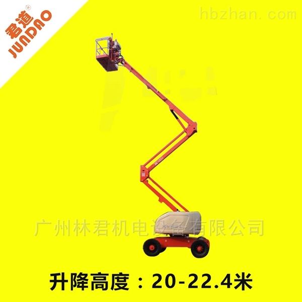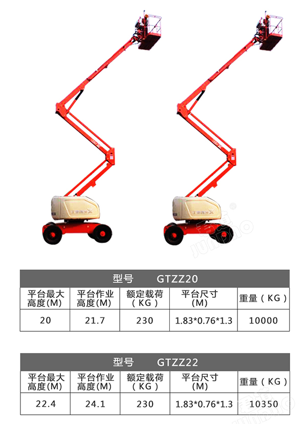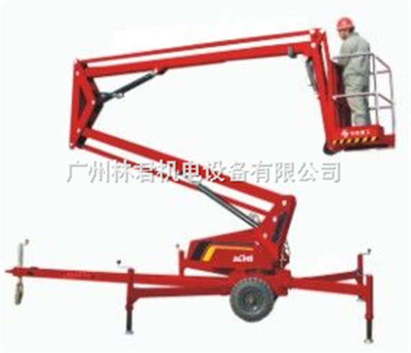 曲臂拖动式升降机,臂架材质采用高强度钢板焊接,平台载重量大,可供两人同时作业并搭载一定的设备,平台具有停电应急措施,具有跨越一定障碍的能力,适用与室内外需要高空作业的场所。