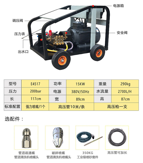 重庆大流量45升每分钟管道疏通冷水清洗机械,E4517管道清洗机是专为管道清洗、疏通以及各类高压清洗机作业设计,可以疏通直径:10-500毫米管道,清洗长度60米。适合小区、市政下水管道的清洗疏通及清除各种管道、列管堵塞物等作业。