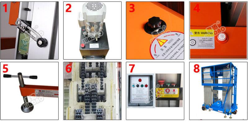 性能特点:双人加强型三柱式铝合金升降机,工作高度可达15.7米,配有地面、平台两套操作按钮及围栏自动升降系统,方便使用操作,电动液压升降,升降柱采用双链条式高强度铝合金型材,安全可靠升降平稳,无噪音液压单元经久耐用,设备移动方便灵活。