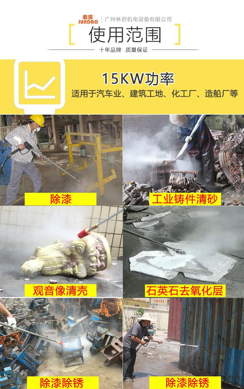 君道PU5015,工业级高压冷水清洗机,清洗压力高达500公斤,流量每分钟15升,采用优质陶瓷柱塞泵及多层工业级密封件,低速电机,设备可连续工作,使用寿命长,胜任各种高难度的工业清洗,可用于釜罐、热交换器、水泥厂预热室结皮、格栅油漆、管道疏通、铸件除锈,广泛于造纸厂、化工厂、汽车制造厂等。