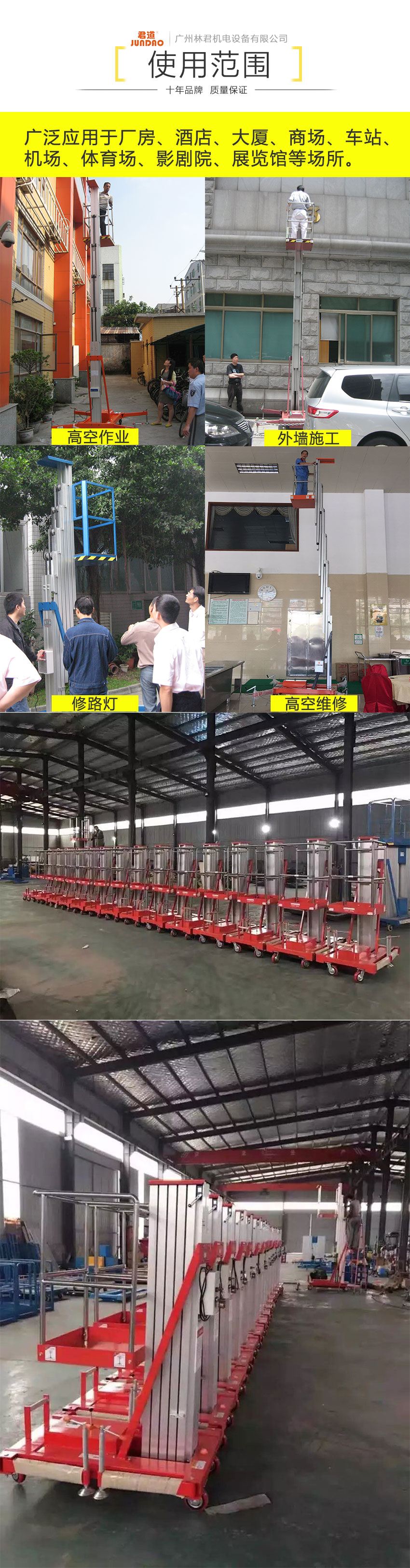 铝合金升降机广泛适用于工厂、宾馆、餐厅、车站、机场影剧院、展览馆等场所,是保养机具、油漆装修、调换灯具、电器、清洁保养、厂房、办公大楼、会展中心,机场,购物中心等需要高空作业的场所,是您减省入手,提高工作效率,帮助您增强竞争力,发挥资源增值的理想设备。