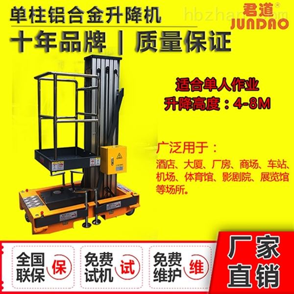 君道GTW8-100单柱铝合金升降机,该平台工作高度可达9.7米,配有地面、平台两套操作按钮,使用方便,电动液压升降,升降平稳,无噪音,该设备体积小、移动灵活,可以通过普通房门,顺利进入载客电梯。