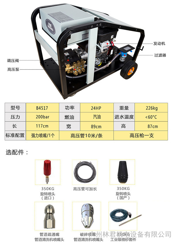 汽油驱动高压管道疏通机标准配置: