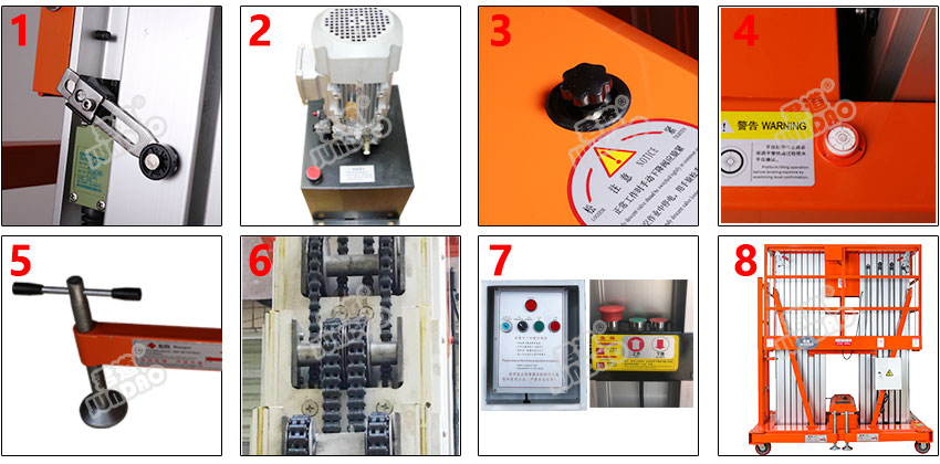 技术参数: 额定载荷:200-250kg 净 重:1500kg 大平台作业高度:17.7m 大平台高度:16m 台面长度:1.60m 台面宽度:0.85m 外型尺寸:2.20*1.25*2.45m 带辅助行走尺寸:2.50*1.25*2.45m 电机功率:2.2kw 电 压:AC220/50HZ 液压系统:内置 下降速度:可调(m/min) 油漆颜色:橘黄色、蓝色(喷塑) | 配置: 1.台面材料:台面板采用花纹钢板与矩形管制 2.材料主梁:铝合金 3.液压单元:采用无噪音液压动力单元 4.液压油:采用抗磨液压油 5.液压输送管:双层高压钢网橡胶管 6.电器箱:电子集成线路板一体箱 7.上升下降按钮:外置 8.上升行程开关:外置 9.链条:加强型BL44415板式链条 10.电线:4*0.75mm²挤压电线 11.轮胎:抗磨聚酯轮 |