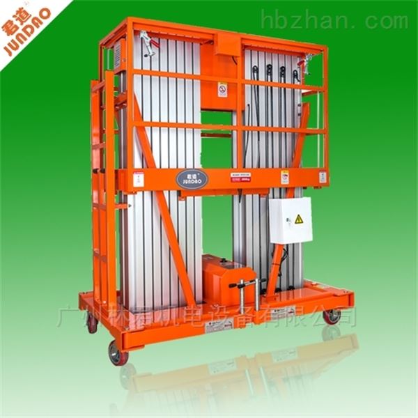 君道GTWY12-200双柱式升降机,双人工作铝合金升降机,工作高度可达13.7米,配有地面、平台两套操作按钮机围栏自动升降系统,方便使用操作。电动液压升降,升降柱采用双链条式高强度铝合金型材,安全可靠,升降平稳,无噪音,液压单元经久耐用,设备移动方便灵活。我们的产品质量保证,售后服务周到,顾客也买得放心。