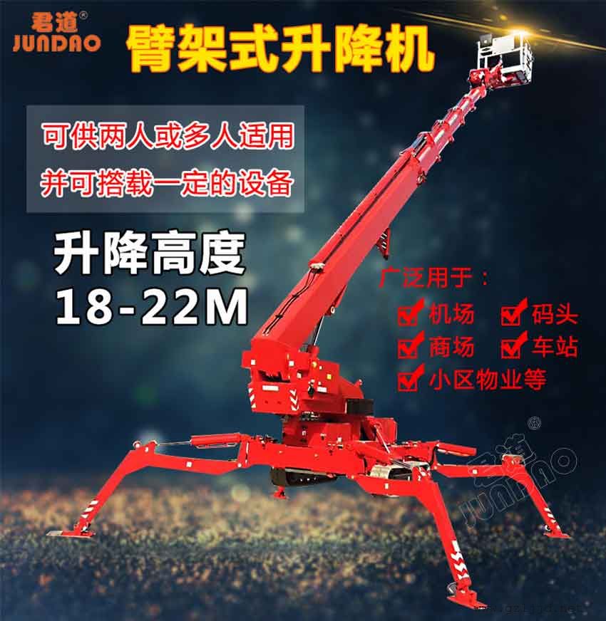 臂架式式升降机用于高空作业的升降设备,可跨越障碍进行高空作业,平台升降到任何位置时,均可边行走边作业,结构紧凑,转向灵活,其地盘的宽度可保证设备进入狭窄的通道及拥挤的工作区域。备用动力装置,可操作工作平台复位,方便的运输方式,可被牵引到任何地方。易于识别的操作面板,多重的机械,电气及液压安全保护,的一体化的液压电器集成系统。曲臂高空作业车广泛适用于市政、电力、路灯、广告、通讯、摄影、园林、交通、码头、机场港口、大型工矿企业等行业的安装维修及登高作业。