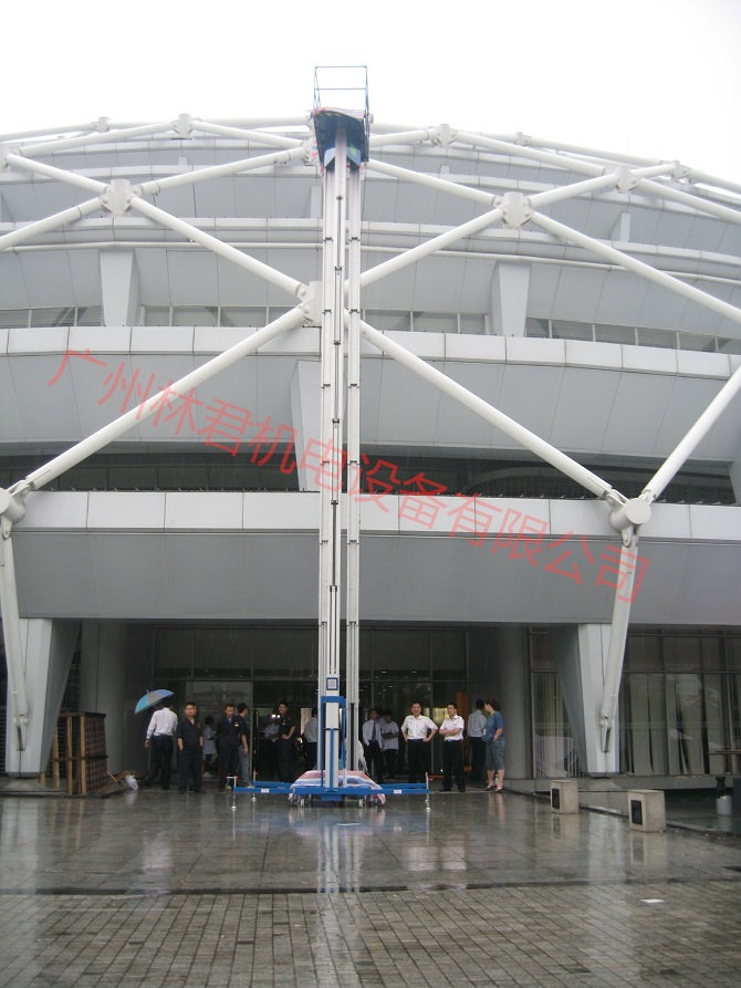 双人加强型14米三柱式铝合金升降机,GTWY14-3三柱式升降机,双人加强型三柱式铝合金升降机,工作高度可达15.7米,配有地面、平台两套操作按钮使用方便,电动液压升降升降平稳,无噪音液压单元经久耐用,设备移动方便灵活。