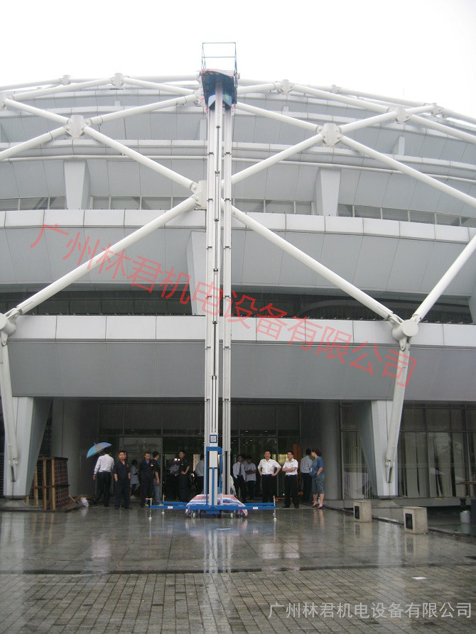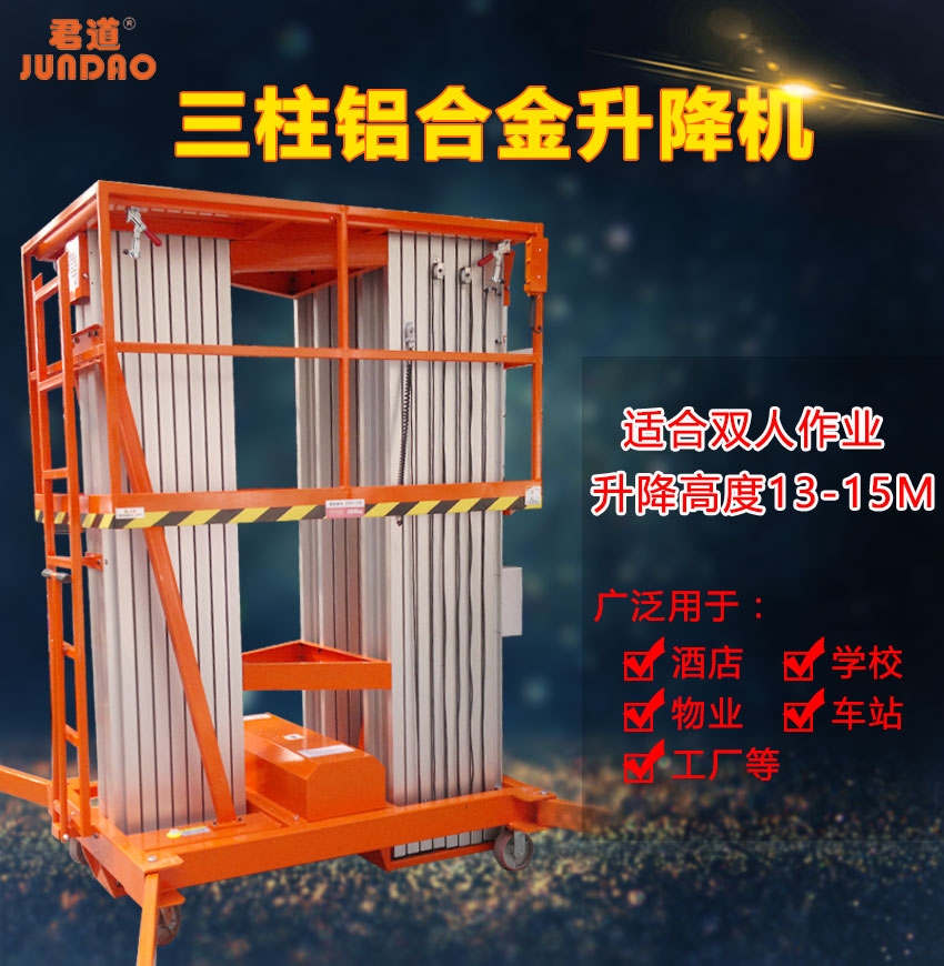 性能特点:双人加强型三柱式铝合金升降机,工作高度可达15.7米,配有地面、平台两套操作按钮及围栏自动升降系统,方便使用操作,电动液压升降,升降柱采用双链条式高强度铝合金型材,安全可靠升降平稳,无噪音液压单元经久耐用,设备移动方便灵活。