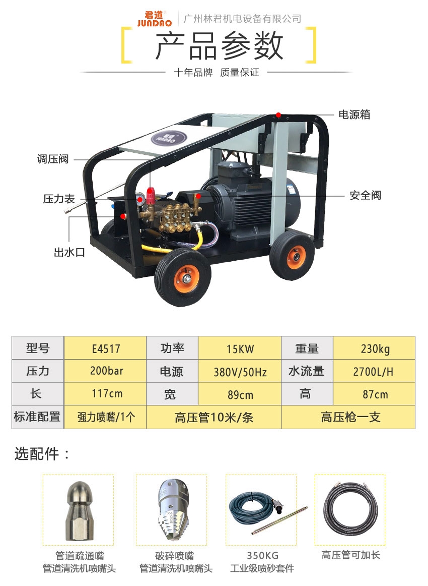 设备冷水高压清洗机E4517。压力可高达200巴,采用陶瓷柱塞及多层工业级密封件,低压启动电机,极大的提高了设备的使用寿命。大脚轮装配移动灵活轻便,适用于汽车业、建筑工地、农业、市政工程和工业企业等领域中,高强度、持续地完成繁重的清洁任务。