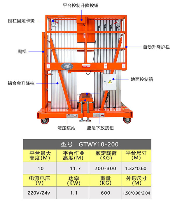 双人工作铝合金升降机,工作高度可达11.7米,配有地面、平台两套操作按钮及围栏自动升降系统,方便使用操作,电动液压升降,升降柱采用双链条式高强度铝合金型材,安全可靠升降平稳,无噪音液压单元经久耐用,设备移动方便灵活,适用与酒店、物业保洁、车站、工厂等进行高空作业工作。